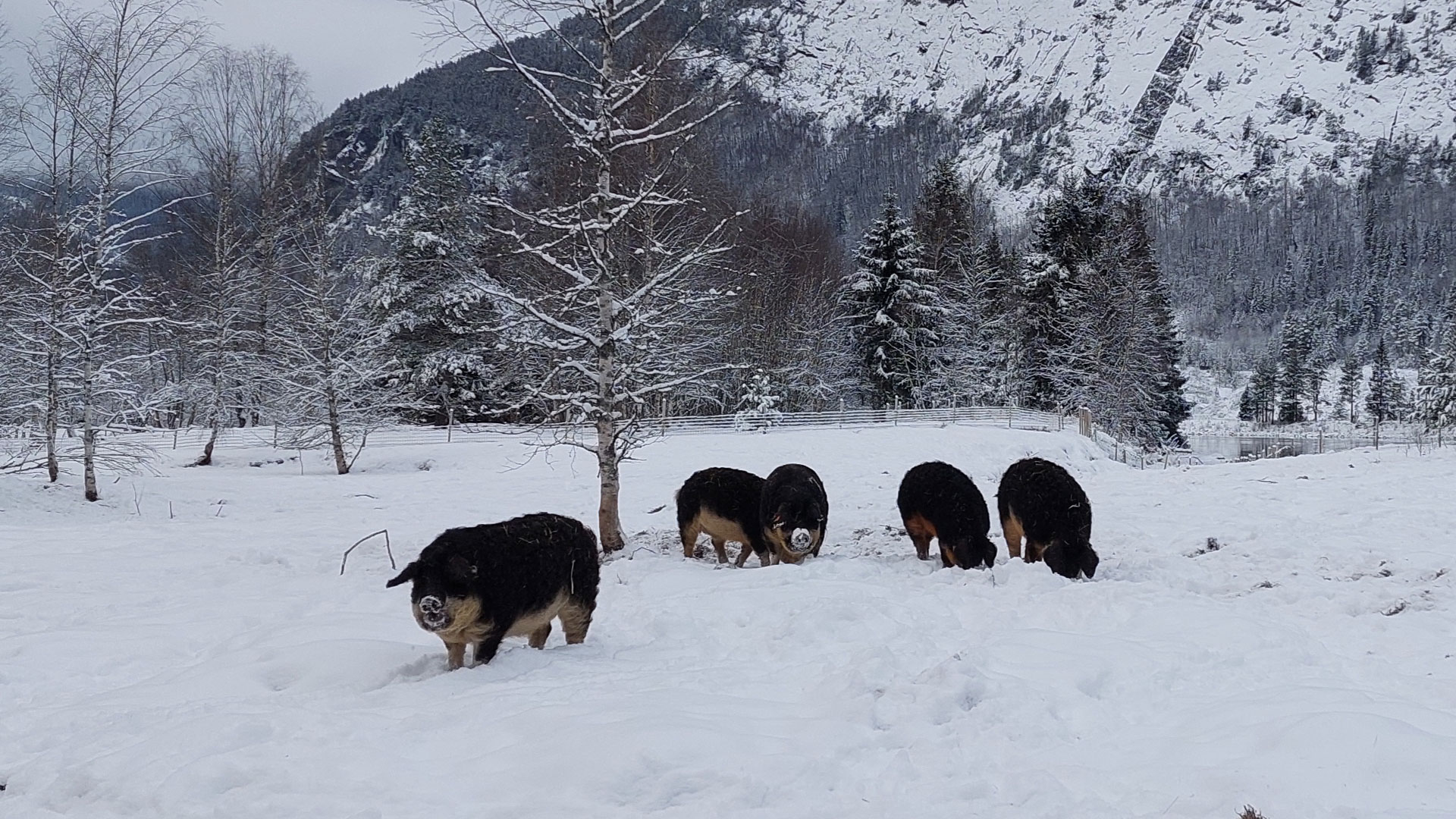 Snøscooter til foring om vinteren er ein stor fordel framom traktoren. Det går raskt og fordi me fort får mange flokkar med dyr er det litt avstand før runden er tatt. Måten me driv på går ikkje ut på å vere effektive, men det kvarteret me kanskje sparer kan me heller bruke til ekstra klapping og kosing når me sit inne hos flokken med gris.